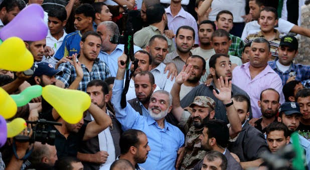 | O líder do Hamas em Gaza, Ismail Haniyeh, aponta uma arma ao aparecer pela primeira vez, desde o início de um conflito de sete semanas, durante um comício de comemoração dos palestinos pelo que eles disseram ter sido uma vitória sobre Israel, na cidade de Gaza em 27 de agosto (Reuters / Suhaib Salem) |